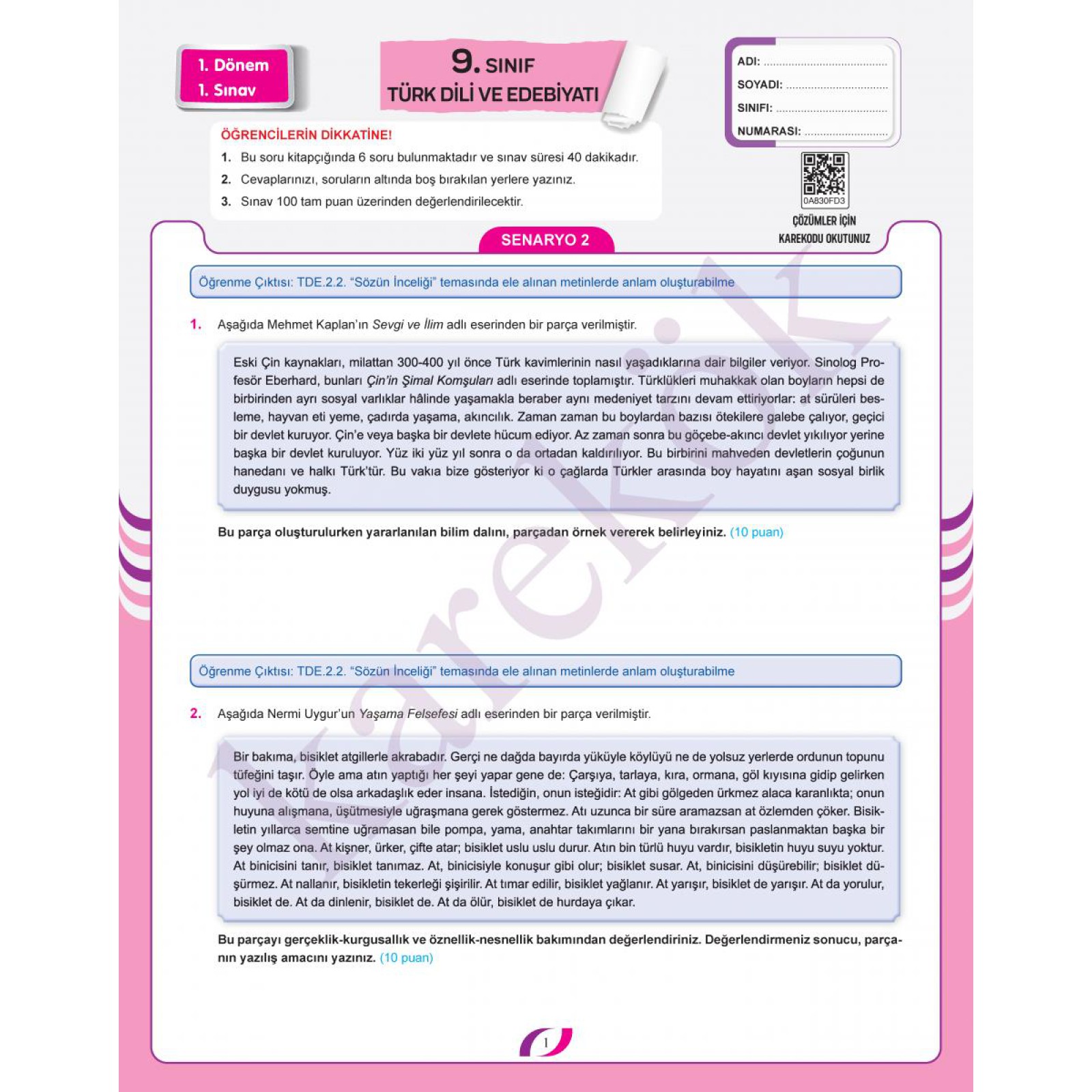Birey PLE - 9.Sınıf Türk Dili ve Edebiyatı Çalışma Kitabı - Kazanım Denemeleri