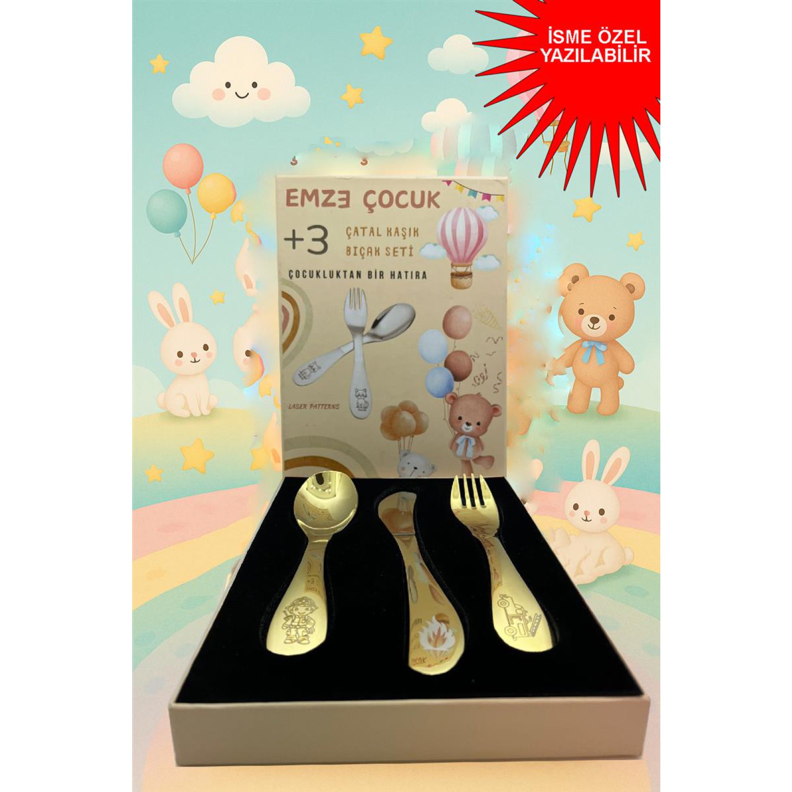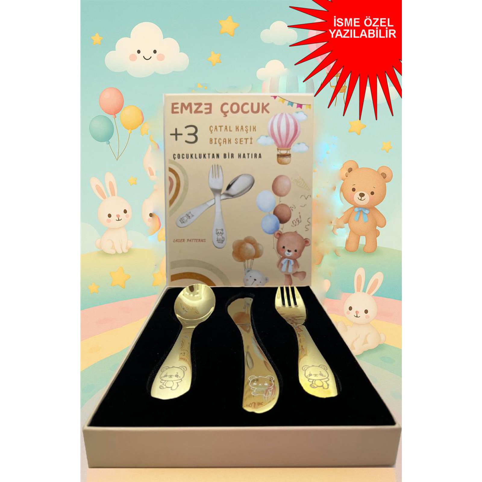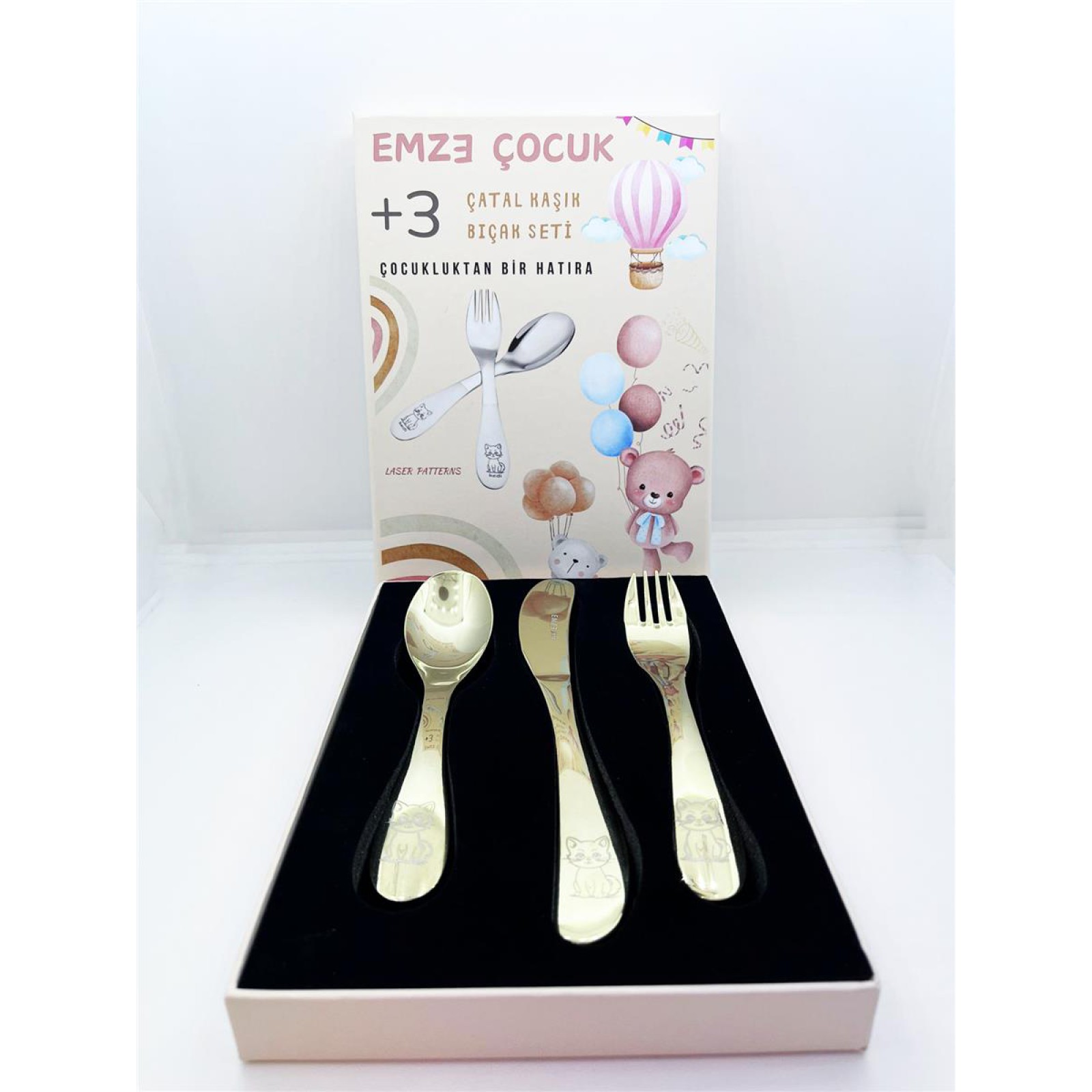 Paslanmaz Çelik Kutulu Titanyum Kaplama Çocuk Çatal Kaşık Bıçak Seti Ayıcık Desenli
