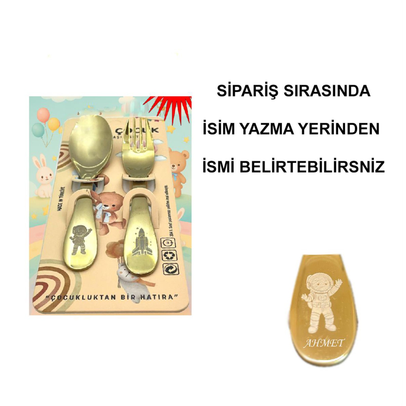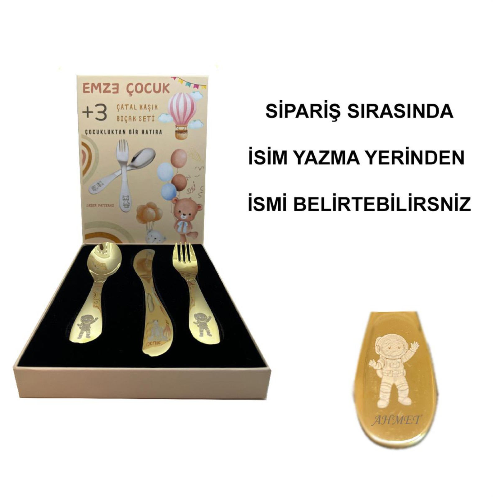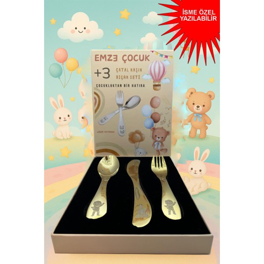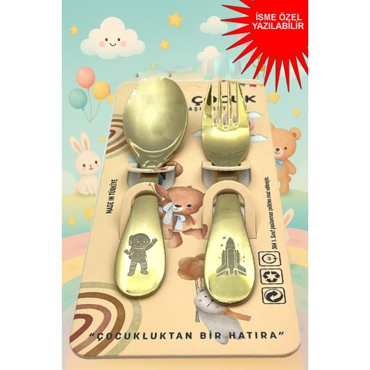 Paslanmaz Çelik Kutulu Titanyum Kaplama Çocuk Çatal Kaşık Bıçak Seti Astronot Desenli