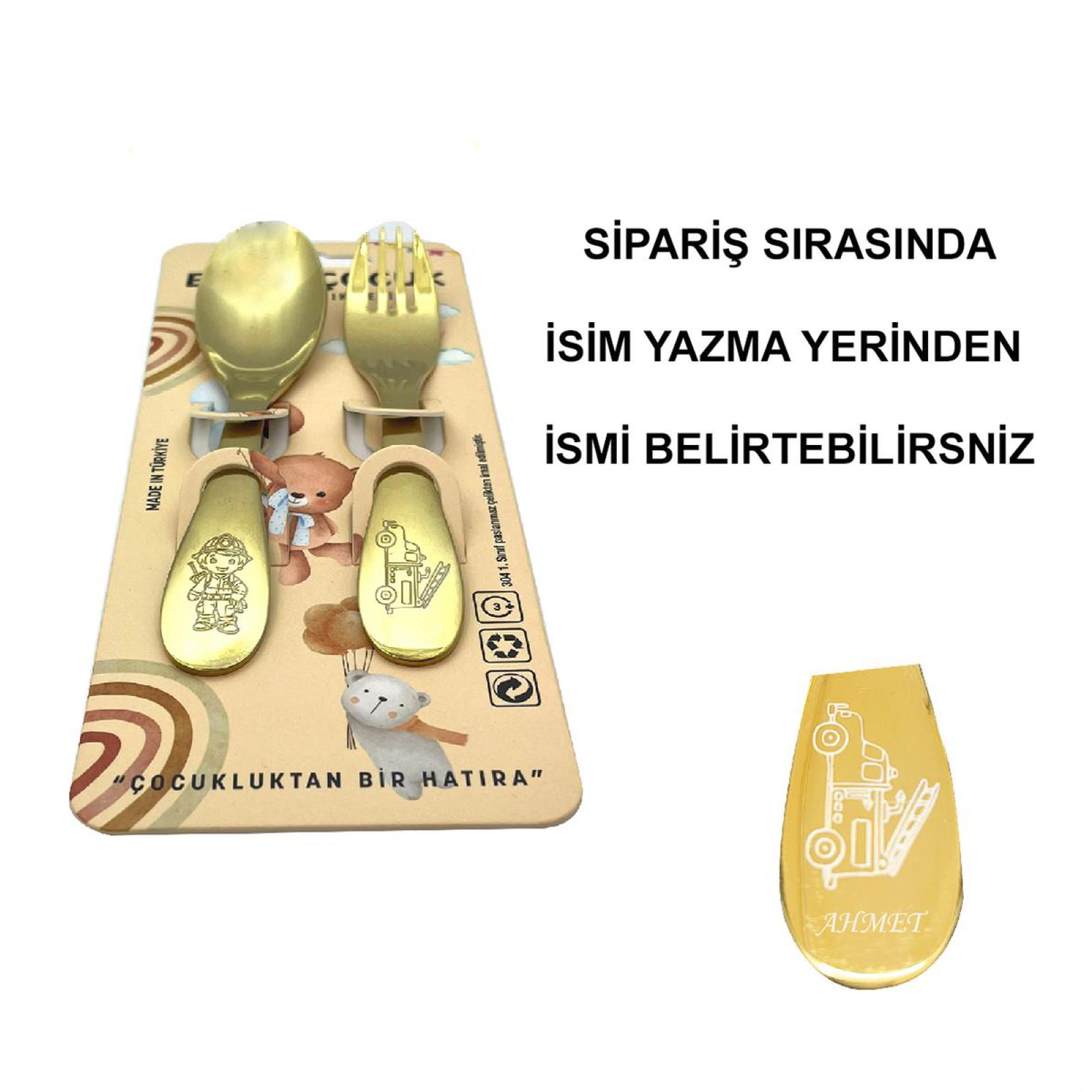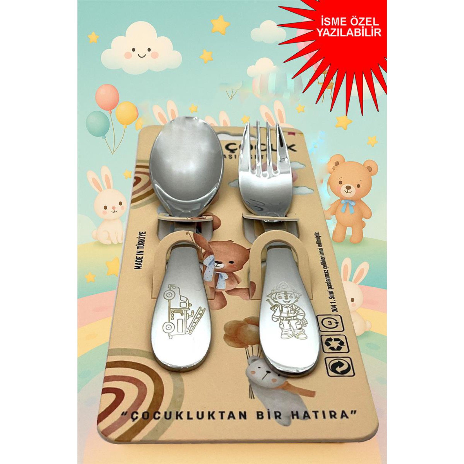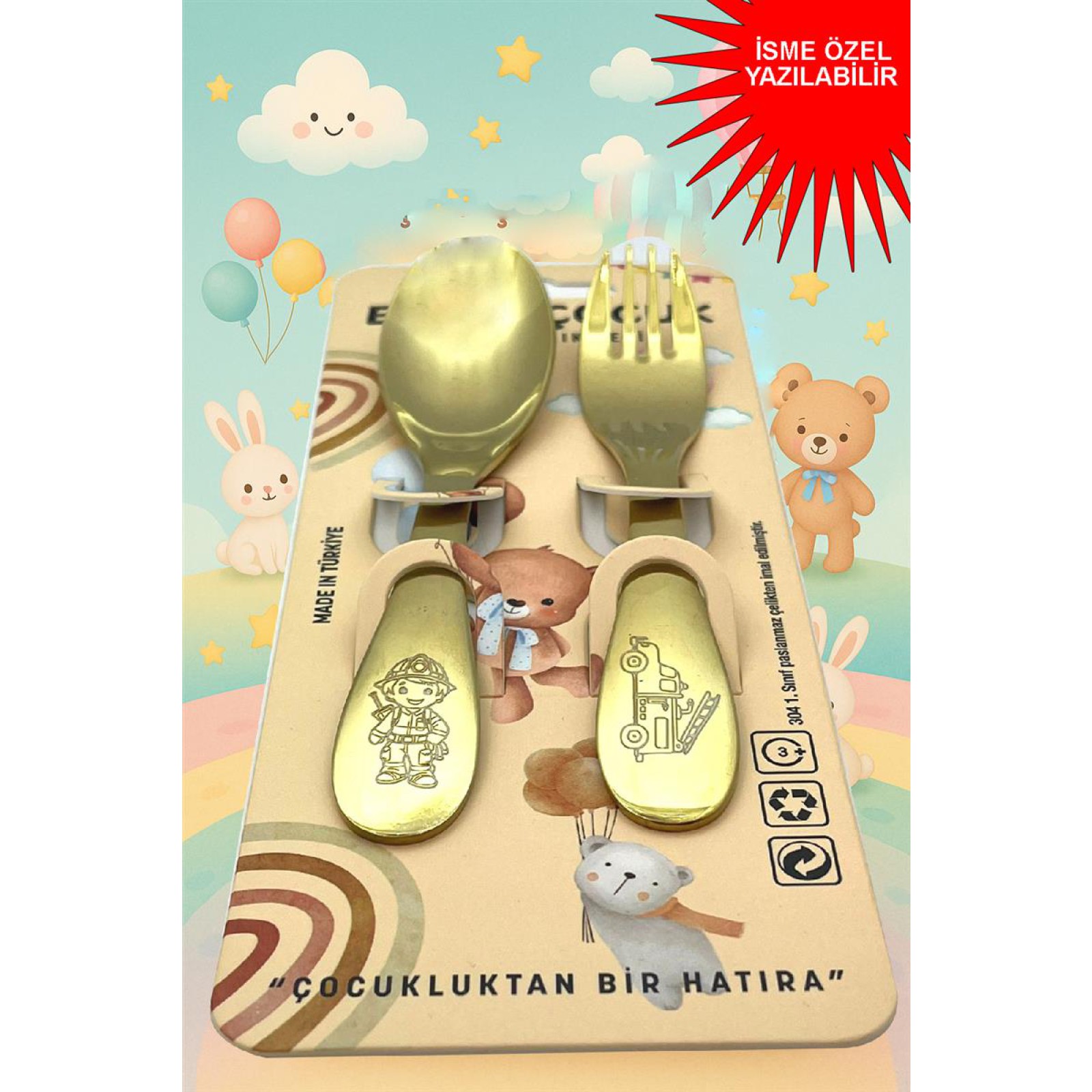 Paslanmaz Çelik Kutulu Titanyum Kaplama Çocuk Çatal Kaşık Bıçak Seti İtfaiye Desenli